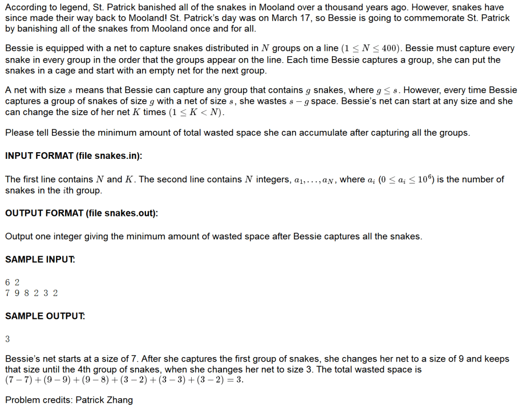 一个大小为S 的捕网意味着Bessie可以抓住任意包含 g 条的一组蛇,其中 g≤s 。然而,每当Bessie用大小为 s 的捕网抓住了一组 g 条蛇,就意味着浪费了s−g 的空间。Bessie可以任意设定捕网的初始大小,并且她可以改变 K 次捕网大小(1≤K < N )。